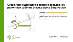 Речь идёт об участке в районе пересечения с улицей Буракова. Частично перекрыта развязка, позволяющая развернуться с бокового проезда шоссе обратно, в сторону проспекта Будённого. Вероятно, теперь для того, чтобы попасть на проспект, будет удобнее сворачивать на улицу Буракова и затем на ул. 3-й Соколиной Горы. Ну а кому нужно развернуться на шоссе Энтузиастов в обратную сторону, возможно, нет смысла уходить перед МСД на боковой проезд, а ехать в основном створе до Авиамоторной и разворачиваться на перекрёстке уже там.